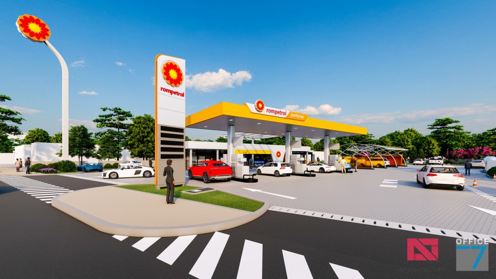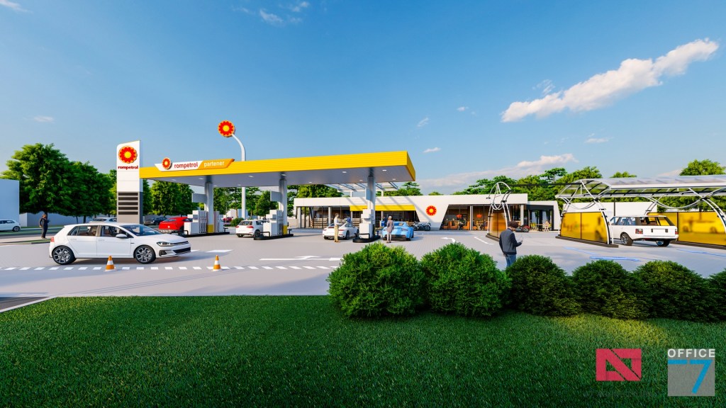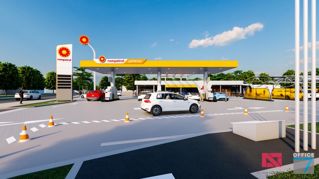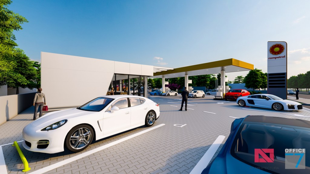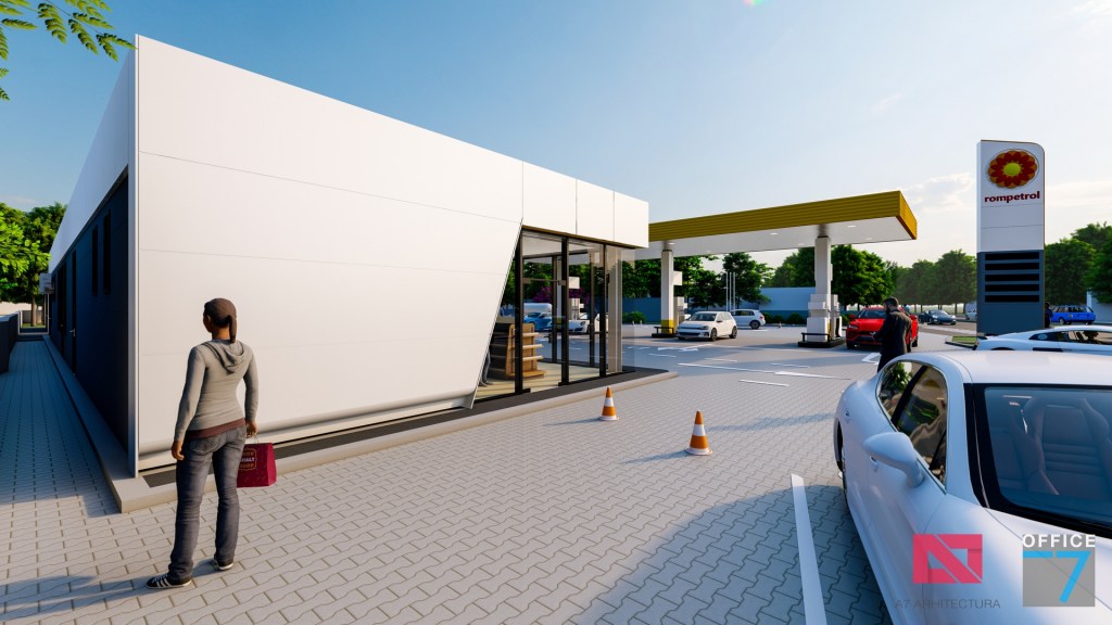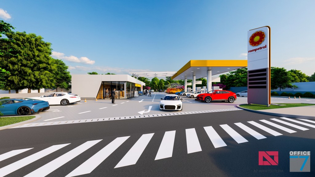 Statie distributie carburanti Rompetrol Craiova pe bulevardul Romanescu si spalatorie auto manuala, concept si proiectare completa.