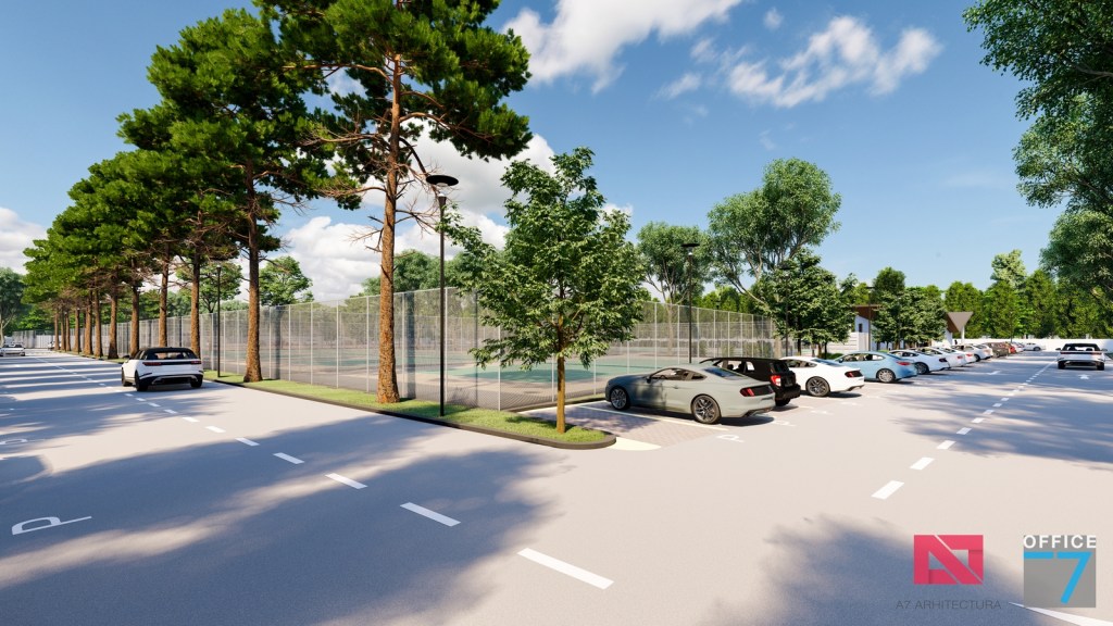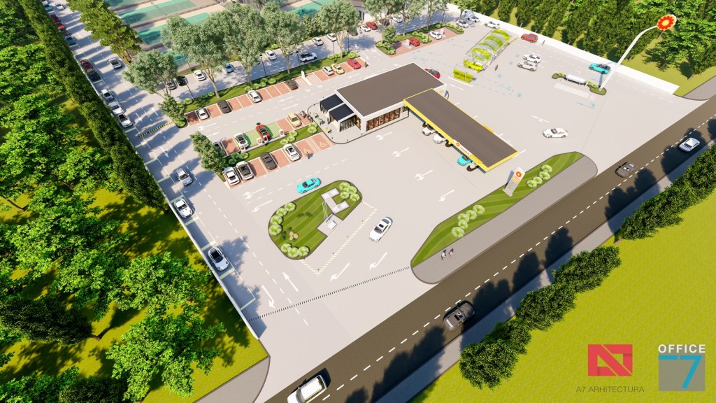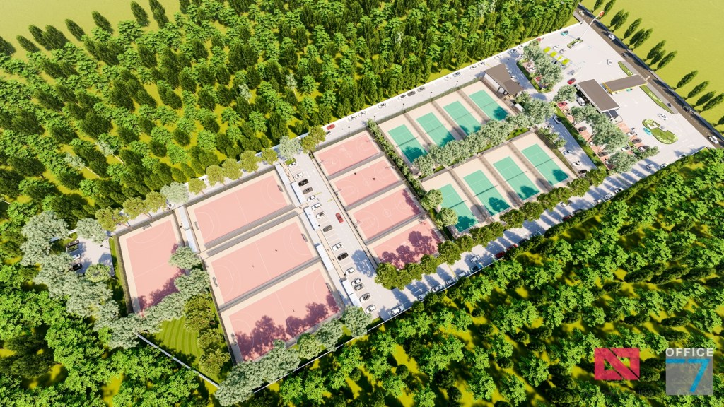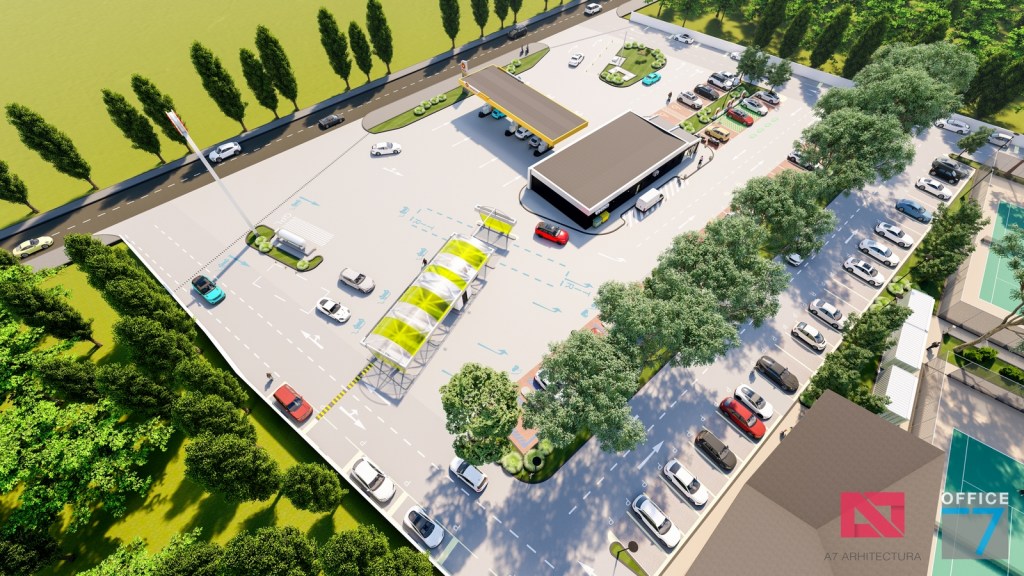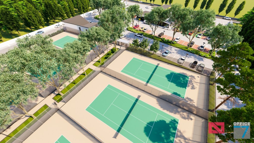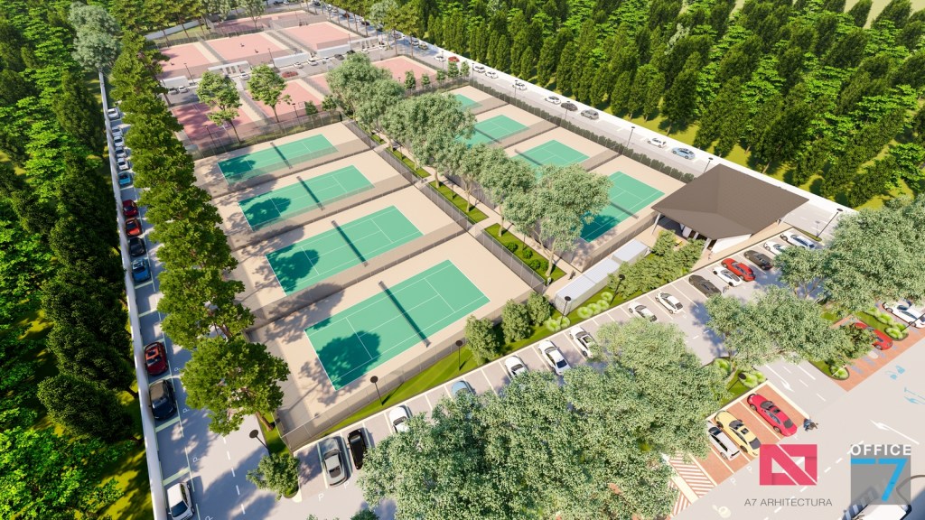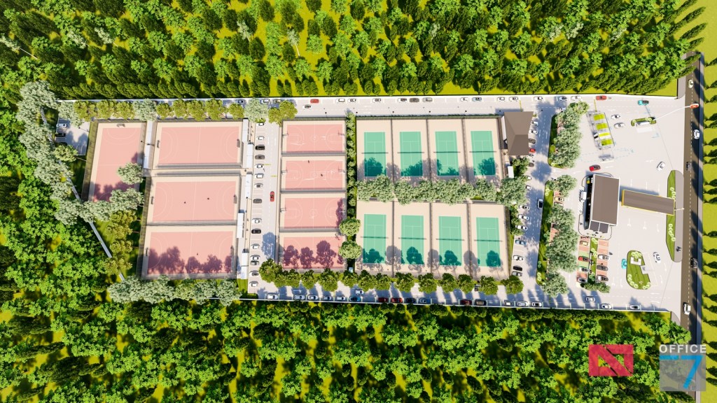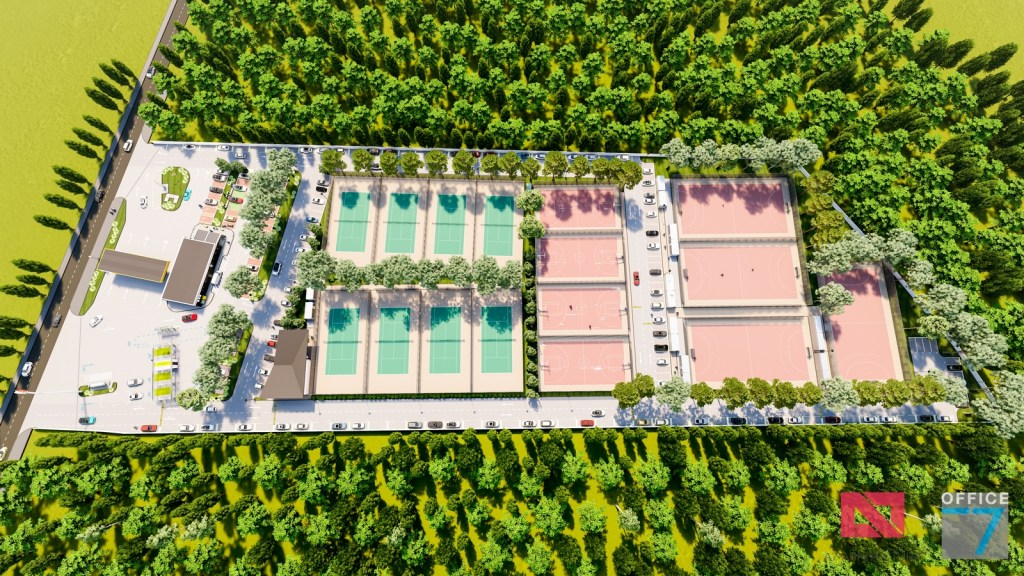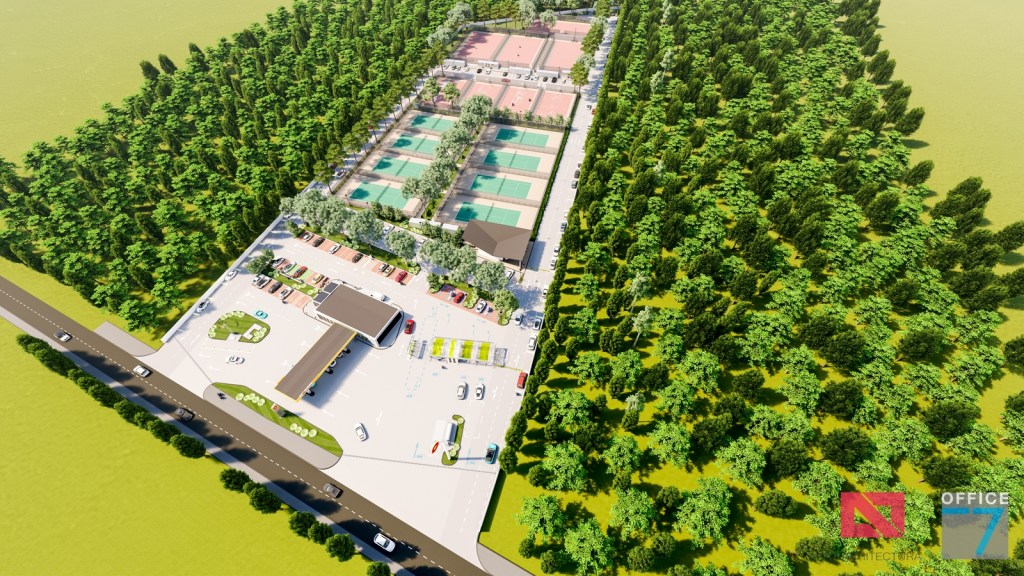 Complex sportiv in Podari, langa Craiova. Propunere amenajare teren existent: complex sportiv (tenis, fotbal, basket), restaurant, spalatorie auto si statie distributie carburanti Rompetrol partener.