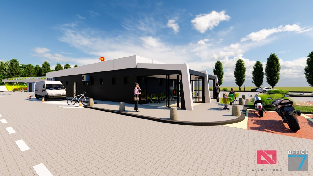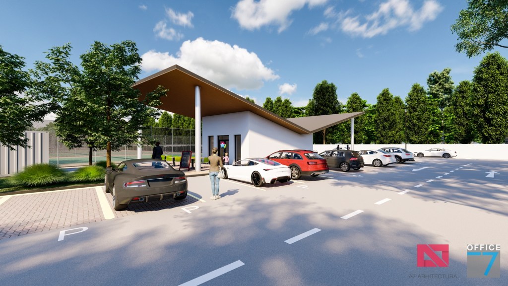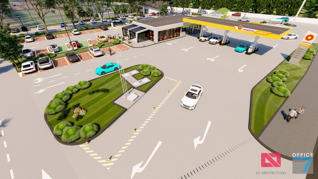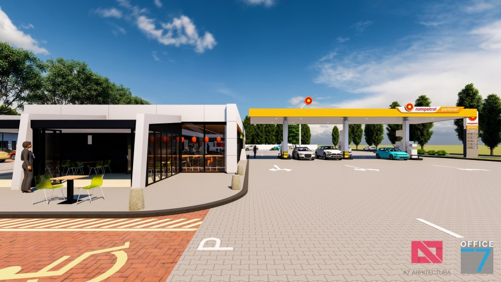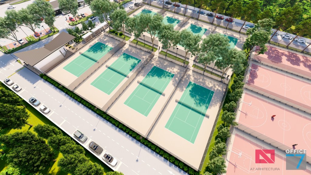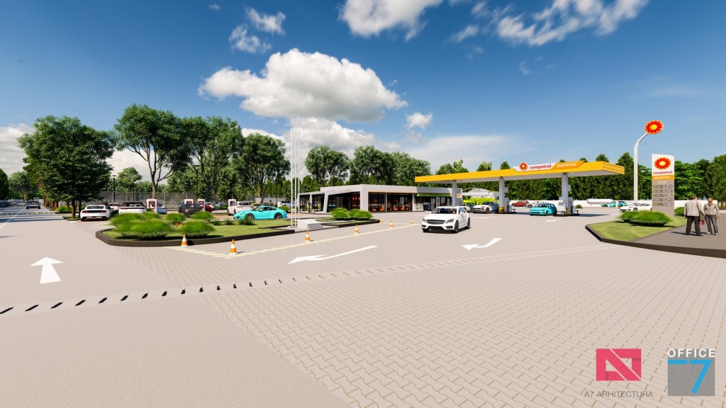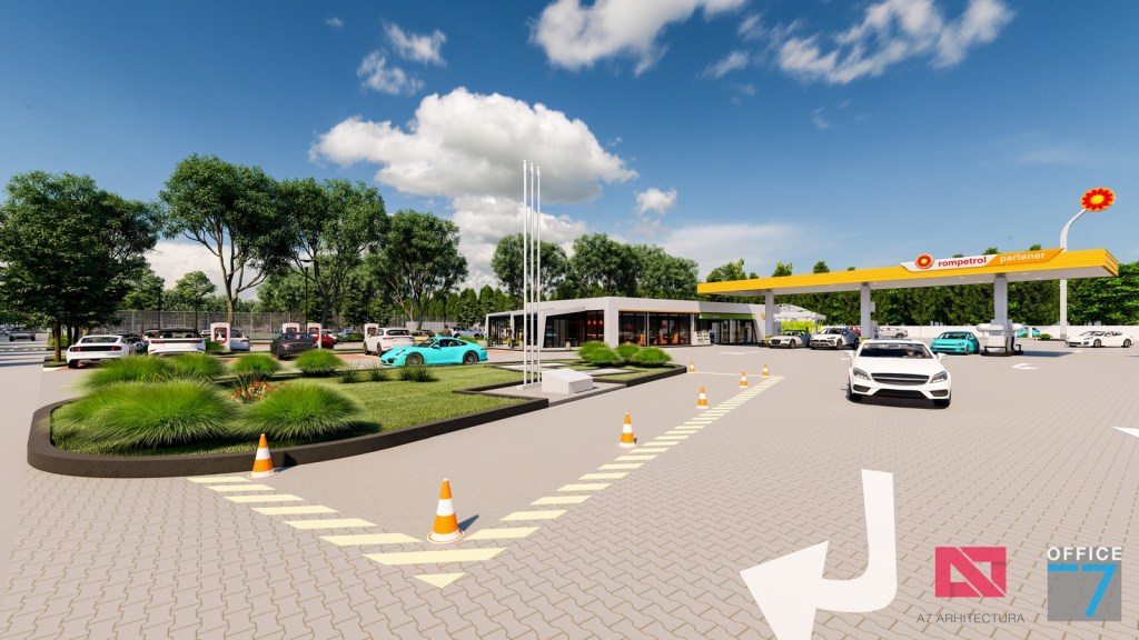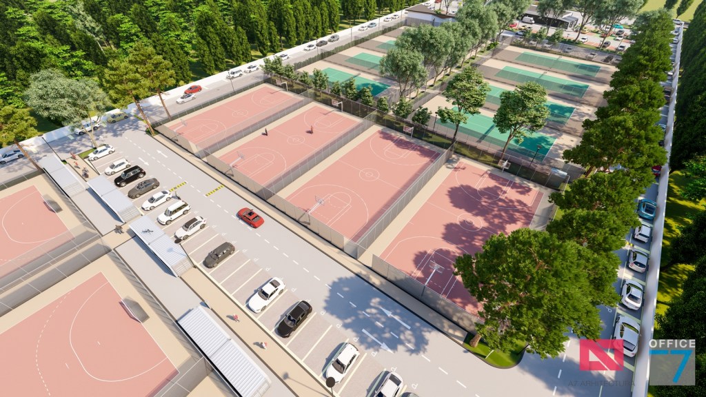 Complex sportiv in Podari, langa Craiova. Propunere amenajare teren existent: complex sportiv (tenis, fotbal, basket), restaurant, spalatorie auto si statie distributie carburanti Rompetrol partener.